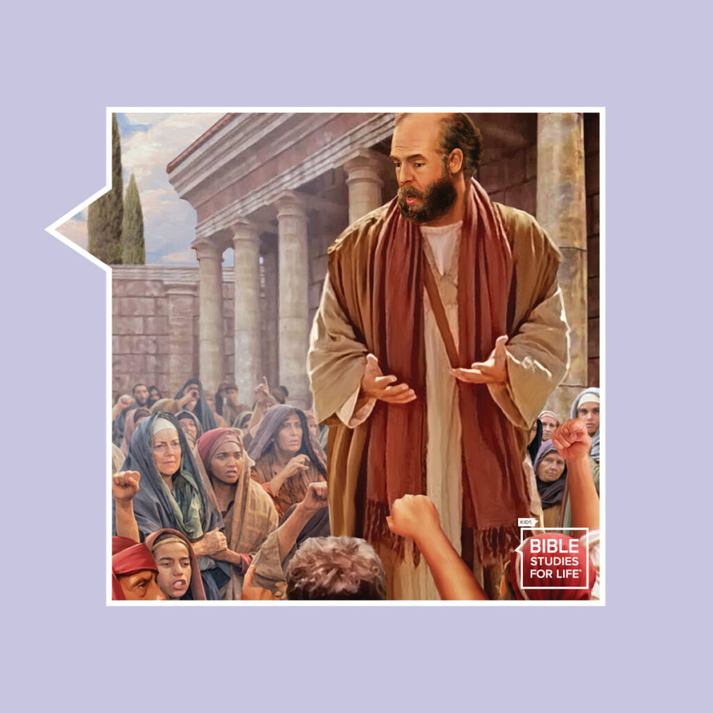 The Bible story teaches that Christians can tell about Jesus even in difficult times. Paul faced dangerous and angry people, but he still told them about Jesus.